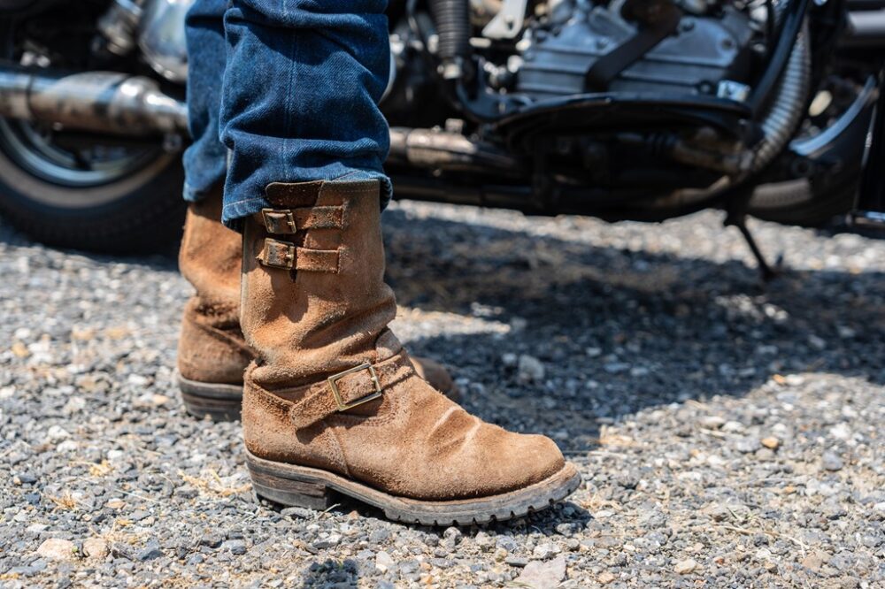 ラングリッツのキャスケードに太めのデニム、そして足元はコンビレザーのモーターサイクルパトロール。まさにオレゴン発のクラシカルなバイクスタイルのお手本。シャフトのラフアウトのエイジングが抜群の雰囲気だ。
