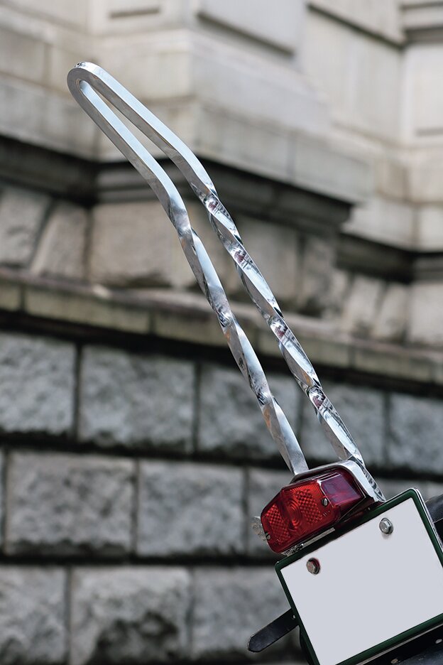 10インチオーバーのロングスプリンガーにフロントブレーキレスのハードなフロントエンド。ハイライザーにナローなロボハンを装備したハンドルまわりは都会のすり抜けに適したスリムなセットアップ。荷物の積載用のシッシーバーは気分でフェンダーステーと取り換えが可能。