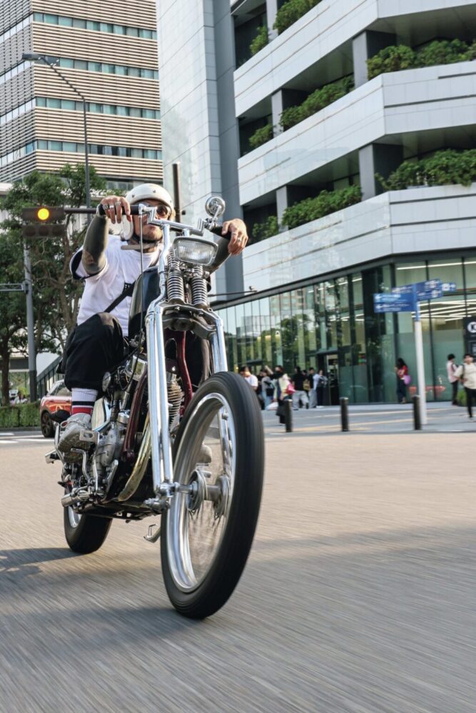 「もちろんどんなバイクでも上手に走りたいし、チョッパーに乗り続けてきたプライドはある。バイクと人間はどうしたって1+1。バイクだけがすごくてもカッコよくないし、逆にほぼノーマルのバイクだってカッコいい人はいる。30年こういうバイクに乗っているから正直普通になっているけど、自分にとっては原付きみたいな感覚でもあって。宝物なんだけど、普段のライフスタイルに欠かせないもの。こだわって作ったって、墓場までは持っていけないんだから乗れるうちに走って楽しまないともったいないでしょ(笑)」