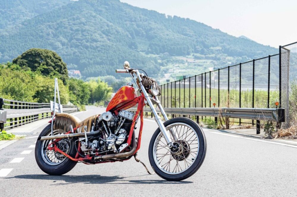フリスコをベースに、ロングライドを想定してビルドされた旅するパンヘッド・チョッパー。 真っ赤なフレイムスとタンクに描かれたスカル&ローゼズがトレードマーク。6インチオーバーの41フォークやハイペグは、見た目だけでなくワインディングのバンク角を意識した機能的なディテールであることもポイント。