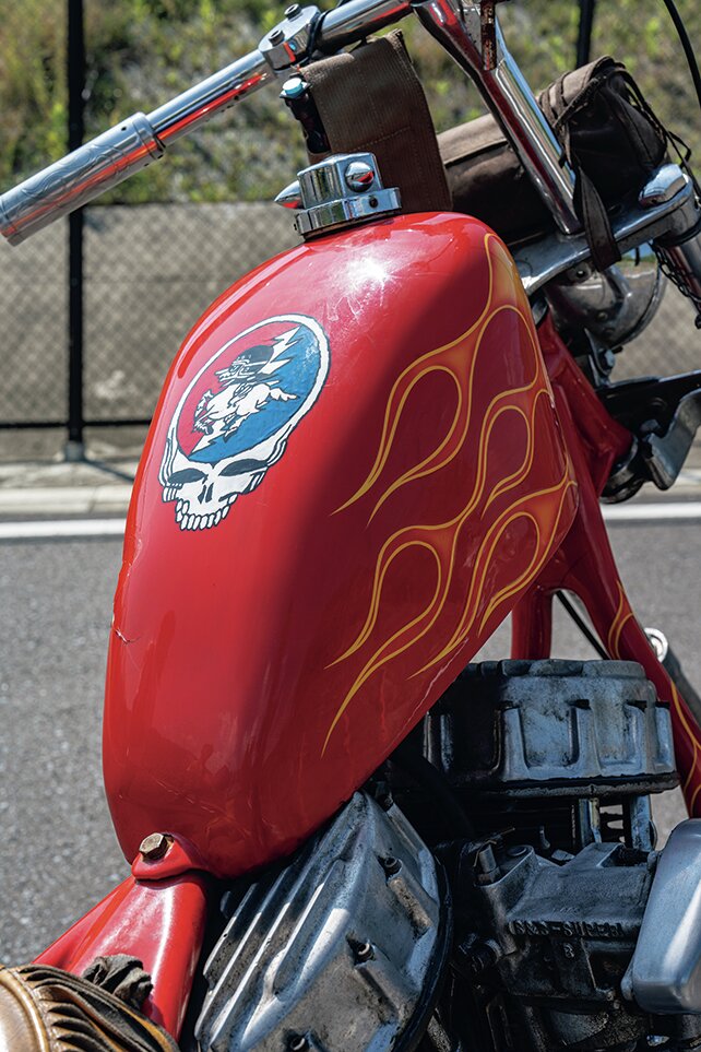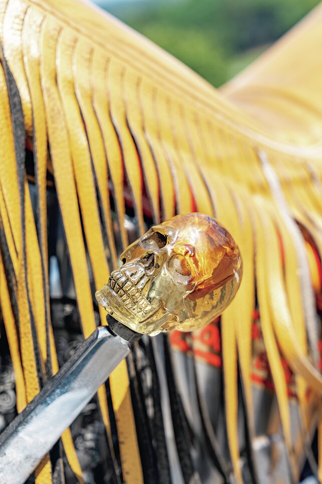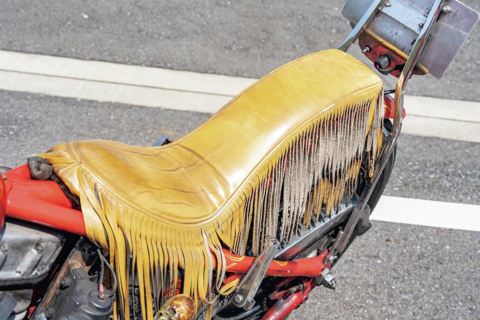 フレイムスのパターンはCHI-CHI’Sのチョッパーがモチーフで、ヘルメットとセットでセルフペイント。エンジンは耐久性を考慮したストックスペック。シフトノブは19MILEのオリジナル。クリアレジンのスカルの中でバラが褪色した雰囲気が◎。フリンジ付きのシートはアトリエティーによるワンメイド。