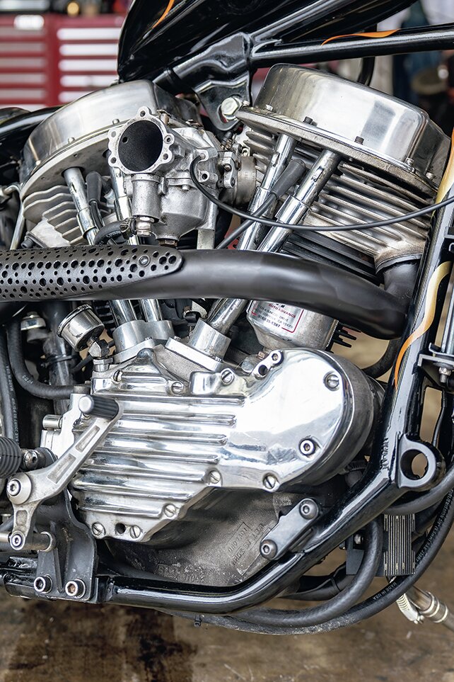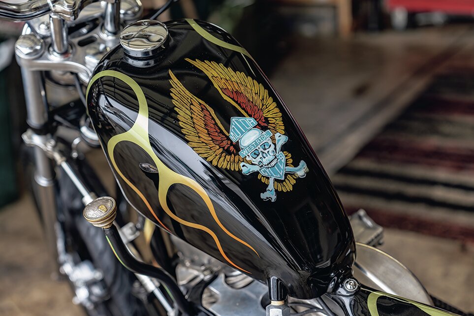 エキゾーストはハイパイプのサンダーヘッダーを装備。スポーツスタータンクはチョップしてナロードして、タンクキャップをリロケート。フレイムスやスカルはペイントショップイザナイの仕事。オープンプライマリー化して、BDL強化クラッチ、Baker6速ミッションを搭載。エンジンパフォーマンスに合わせてアップデートされている。