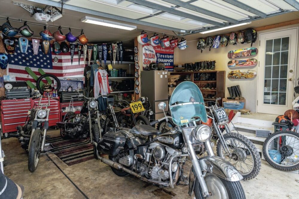 中井さんのプライベートのガレージにはパンヘッドを中心に、チョッパーやフルドレス、レーサーなどさまざまなスタイルが並ぶ。基本的なメインテナンスはここで自ら行っている。