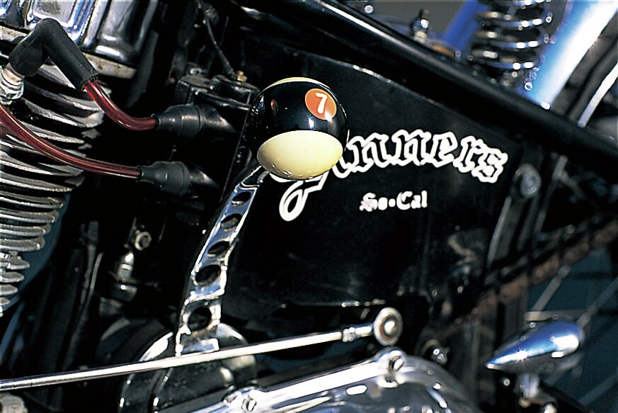 チョッパーといえばスーサイドクラッチにジョッキーシフトと考えがちだが、実はシフト方式にはいくつかのバリエーションがある。上にあるのが、まさにその典型でコレはリッチモンドスタイルのヒールシフト。ラチェットトップに直接取り付けたステーをカカトで操作するのだが、生まれた理由はパーツがなかった、というだけ。現実は単純である。