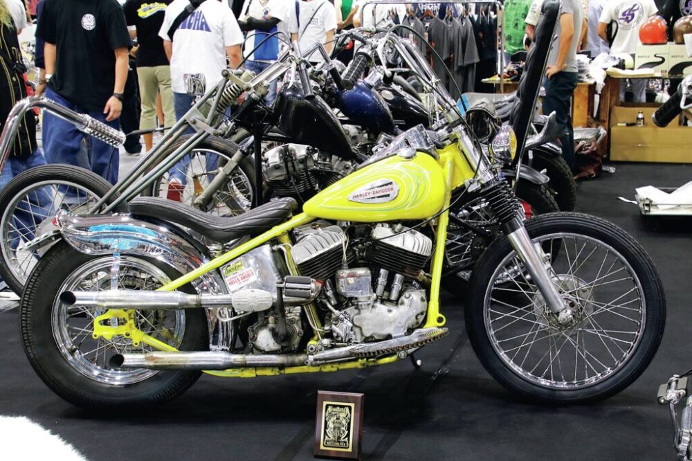 神戸のチョッパー好きから支持を集める「シウン クラフトワークス」。今回のショーでは同店がこれまで製作してきたオールドスクールやロングフォーク、フリスコなどさまざまな車両を計14台(!!)展示。一台一台仕様の異なるチョッパーは多くの目をひいた。