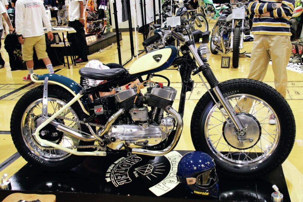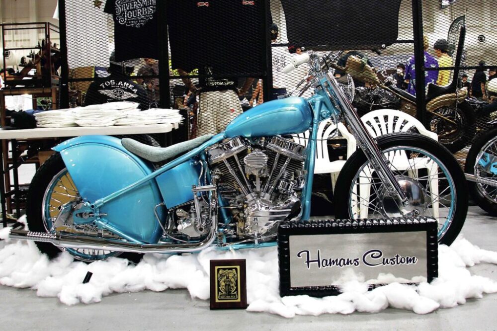 個性的なリアフェンダーが目をひくパンヘッドは「ハマンズ」による一台。細部も左右両出しのマフラーやスリムなフロントまわり、繊細なタンクの造形など、こだわりが満載。