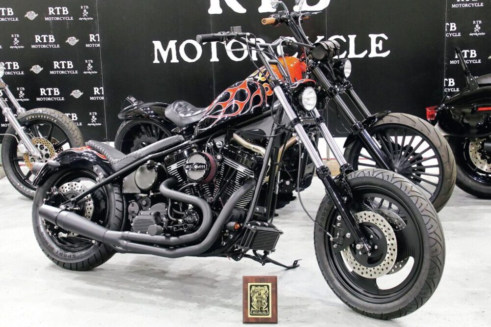 大阪の「リボルト」によるショベルヘッドチョッパーは、キックペダルをはじめ、ステーを兼ねた作りのフェンダーチップに、これでもかといわんばかりに施したツイステッド加工やエンジン各所の彫金など、1位を獲得するのも納得の作り込み。完全に“球”のオイルタンクも強烈!!