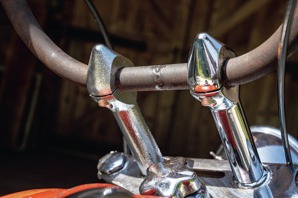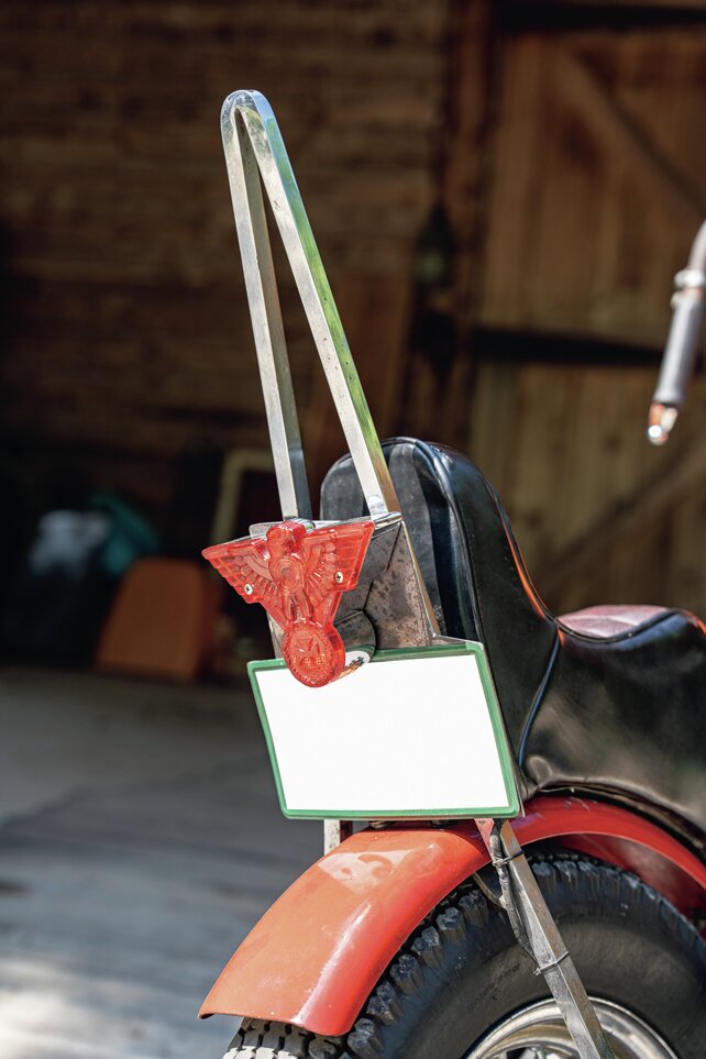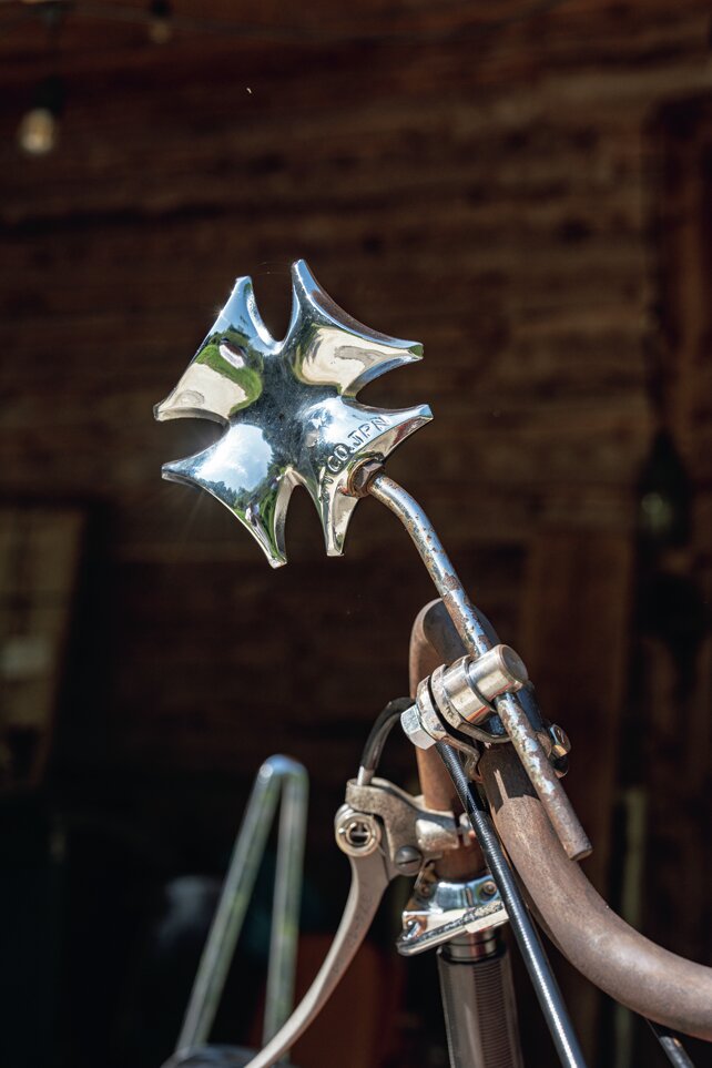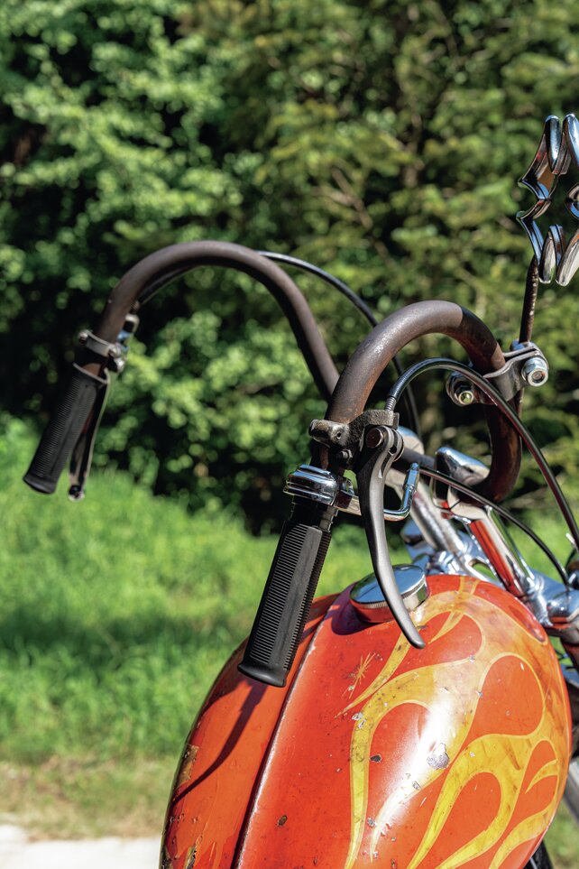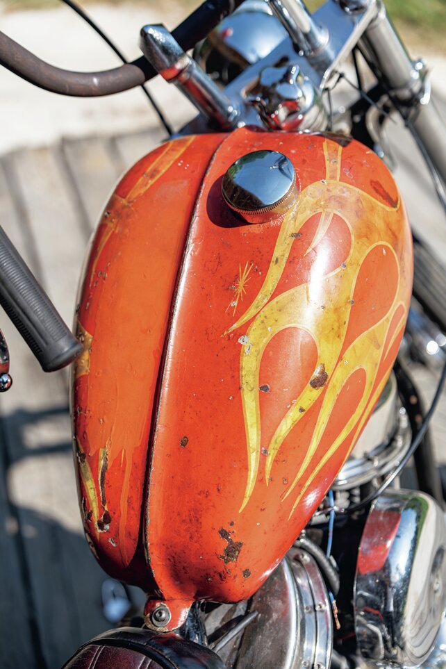 70sの希少なウォーバードテールライトのオリジナル。プルバックバーは当時の形状をイメージして理想のアールを具現化し、前代未聞のサビ仕上げの新品。サビが進行しない加工済みなので安心して使えるのも◎(価格未定)。リブ付きのビッグマスタングタンクは70sのオールドペイントが肝。