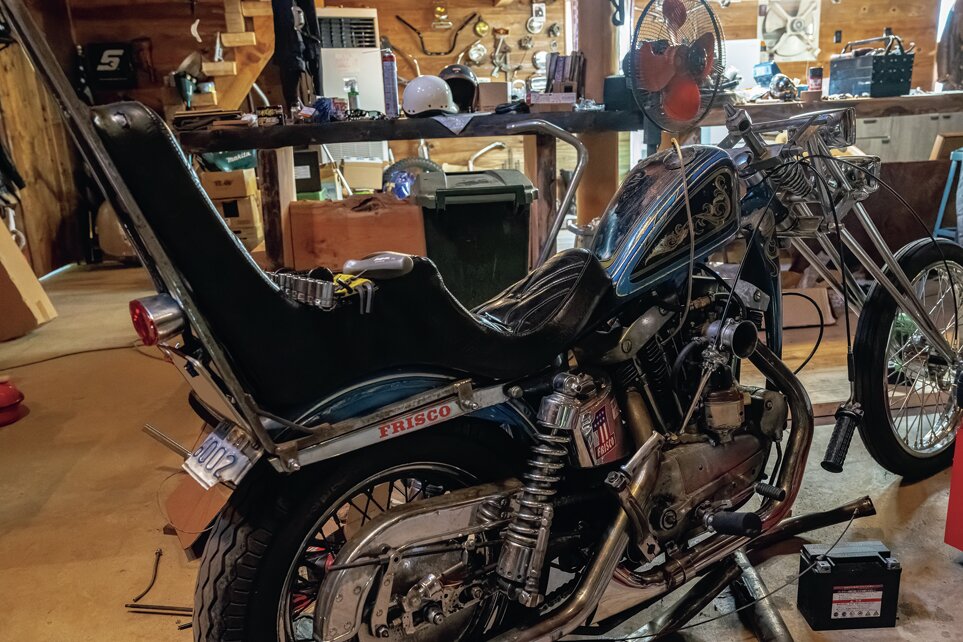 高橋さんの70sブームが現れた現在進行中のプロジェクト。上はオールドペイントが特徴的なサバイバー。下はAmen Mfg.のプランジャーサス式フレームを軸に作り上げる予定。