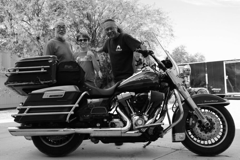 アリゾナ在住のヤス・ワタナベさんからロードキングをお借りした。知る人ぞ知る名メカニックのヤスさんがチューニングしたツインカム103は、8万マイル以上走っているのに絶好調。シールドが装着されているのでノーヘルでも快適。3600マイルの旅も快適に走り切れた。ヤスさん、ありがとう。