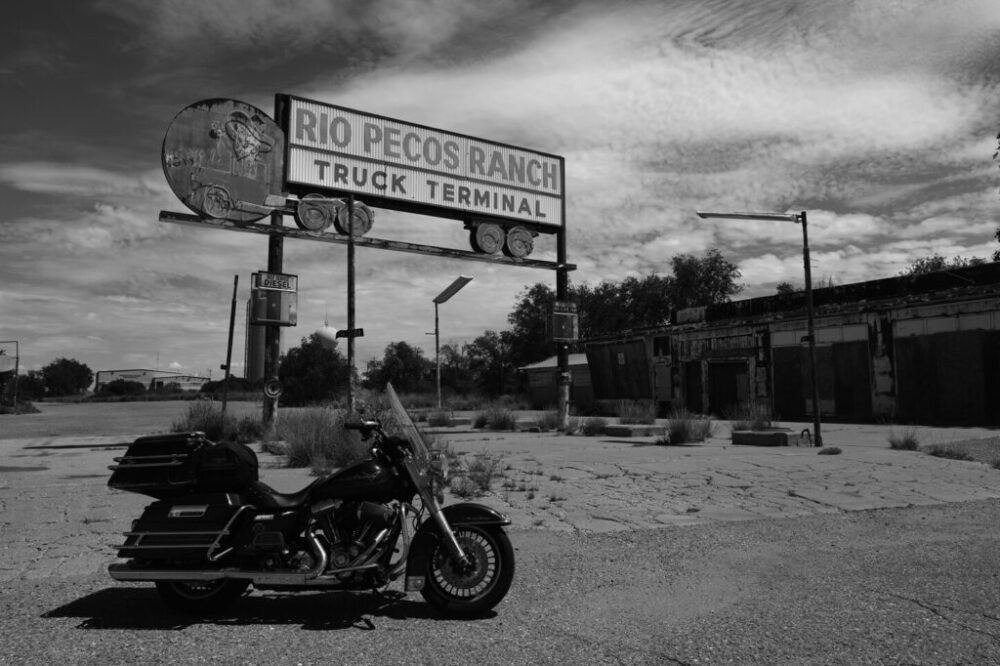 ニューメキシコとテキサスの州境近くで真っ黒な雲が行く方向に広がっている。数分後には、びっくりするほどの雷鳴と大雨。レインウエアを着る間もなく大粒の雹が降ってきた。雨で前がほとんど見えない上にノーヘルの頭や顔にかなりの衝撃。さすがにこれはヤバいとバイクを停めた。雲は進行方向に伸びているので、やり過ごしても先でまた遭遇するだろう。覚悟を決め、ヘルメットをかぶって走り出す。ラッキーなことに10分ほどで青空が広がった。