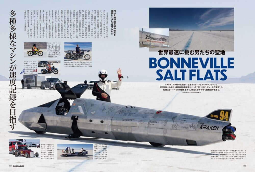 どこまでも真っ白な塩の平原が続く「ボンネビル・ソルトフラッツ」。高低差がまったくなく、長い直線コースが設定できるとあって、ここでは100年以上も前からレースや最高速チャレンジが行われてきました。そんな“聖地”で果敢に最高速に挑む日本人をはじめ、貴重な現地の模様を取材。そんな空気感に触れたら魅了されてしまうこと間違いなしです!!