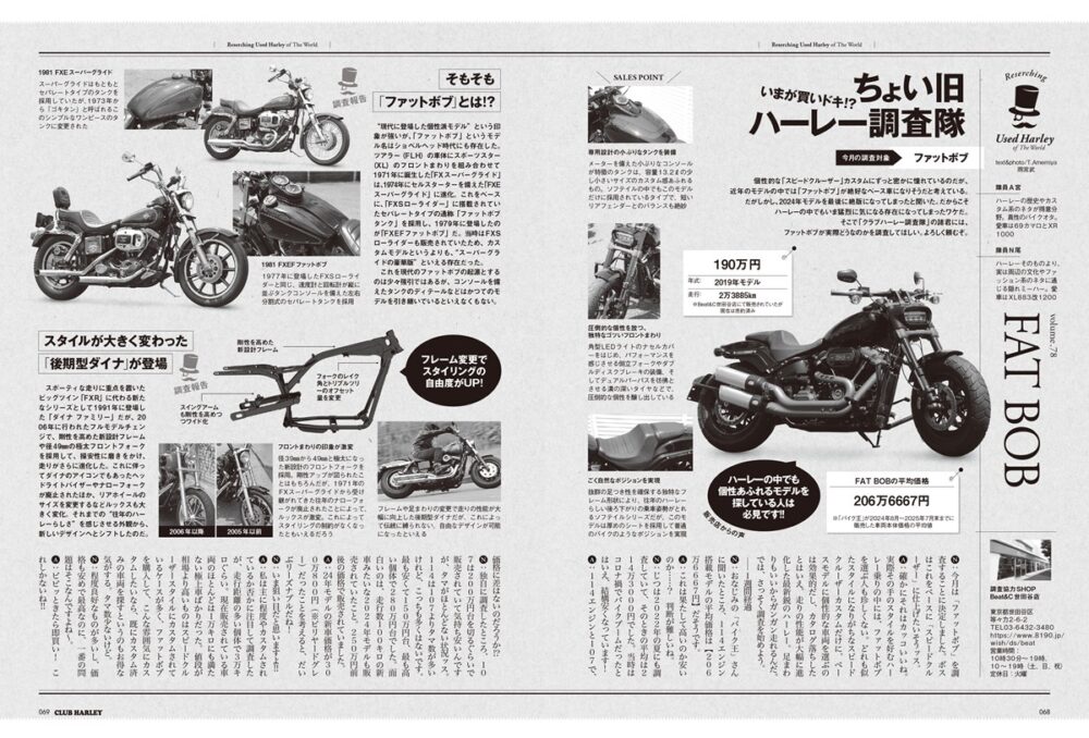 毎月1モデルをピックアップして現在の中古相場はもちろん、新車販売期間中に行われた仕様変更などを詳細に紹介する長期連載企画が「ちょい旧ハーレー調査隊」です。今月は、2024年モデルを最後に絶版となってしまった「ファットボブ」を調査しました。マイナーながらも、その筋ではコアな人気を誇るこのモデル、気になっている方は必見です!!