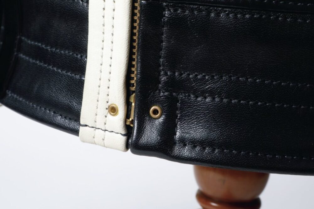 要所に使われている白いホースハイドは、経年変化も楽しみなポイント。ムートンエリはスナップボタンで着脱可能なので、季節などで使い分けられる点もうれしい。