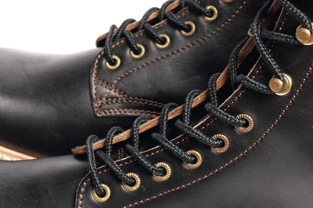 茶芯のホースバットを使い、深みのある豊かな表情の一足が完成した。1940年代のクラシカルなワークブーツをベースに、細い糸で施したトリプルステッチや、三角の補強ステッチなどでヴィンテージらしい佇まいに。防水性に優れた製法により、耐久性と快適性も両立。まさにバイカーのためのワークブーツなのだ。10万7800円