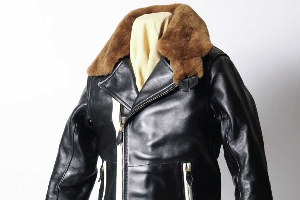 最新作となるジャケットは、ツートーンの馬革を使った、ムートンエリ付きのダブルライダース。サンプリングした個体は「POLICEMAN JACKET」と呼ばれるスーパーヴィンテージで、いまや幻といわれるほど。ポケット口など、程よい配分で白い革が使われているため、着こなしに採り入れやすい。32万7800円