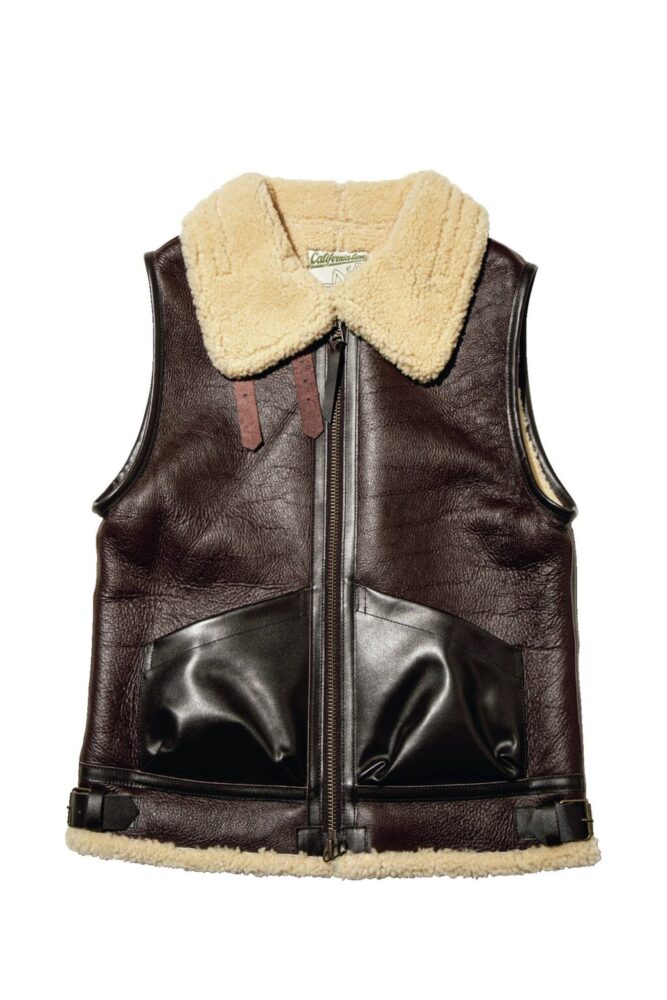 1930〜40年代にかけて活躍したムートン製ボマージャケットをベストにモディファイしたようなデザインが個性的。フロントは両ポケ仕様に改良し、表革を配することで耐久性をアップ。ライダースの上に羽織れば冬でも快適。10万7800円