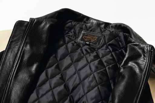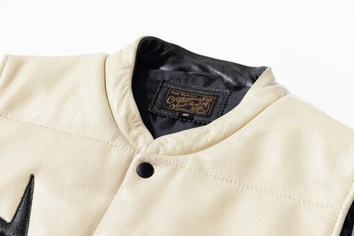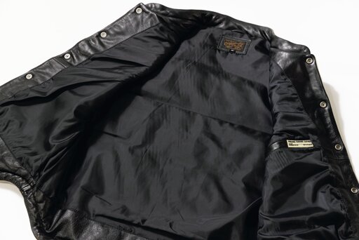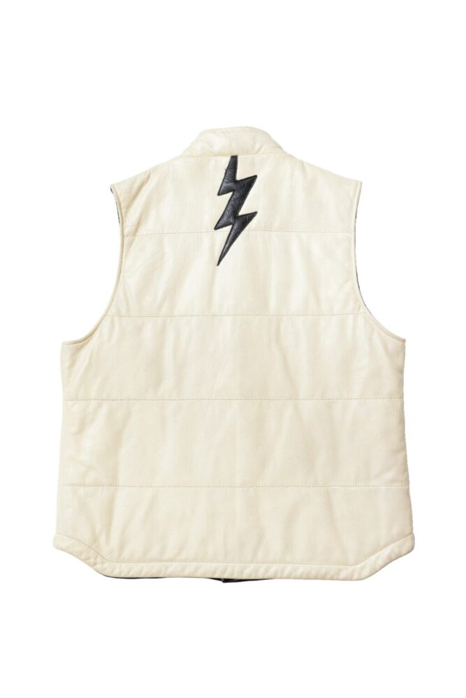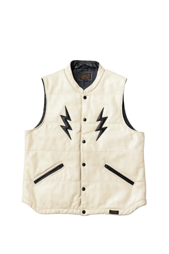 チョッパーシーンのアイコンのひとつとなっているサンダーパターンをさり気なく落とし込んだレザーベスト。ライニングにはシンサレートを使っているので、薄くても保温性を確保。アウターの上からも着用できるようにアームホールを広く設計している。アイボリー部分には汚し加工が。3万3000円