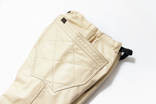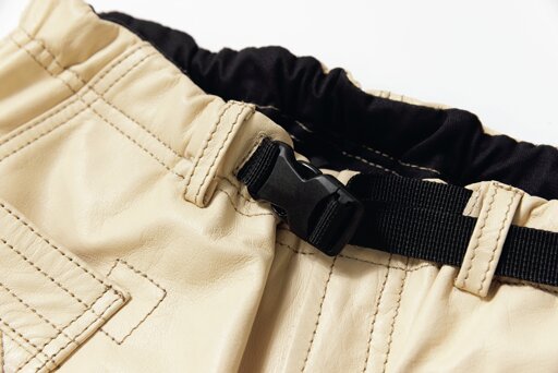 テーパードシルエットに仕上げたレザーライドギアパンツ。サイドには70年代のモトクロスパンツに見られる腰パッドをイメージした大きなポケットを配しているのがポイント。またウエストにはアウトドアでおなじみのウェービングベルトが付属する。2万9800円