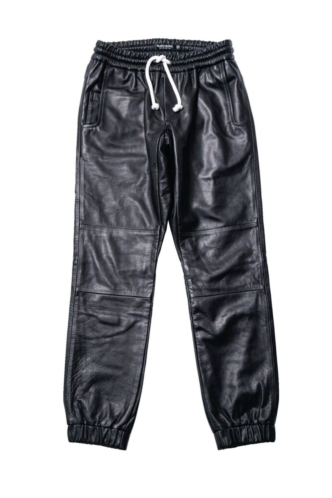 スエットでおなじみのイージーパンツをオリジナルの水牛レザーで再構築したアイデア作。ジャケットでは1.2㎜程度であるが、0.8㎜にすることで、柔らかくて快適な履き心地に。裏地にはポリエステルのストレッチ生地を用いているので、肌触りにもよく、じつに快適である。9万9000円(プロテクターなし)、10万1200円(膝プロテクター付き)