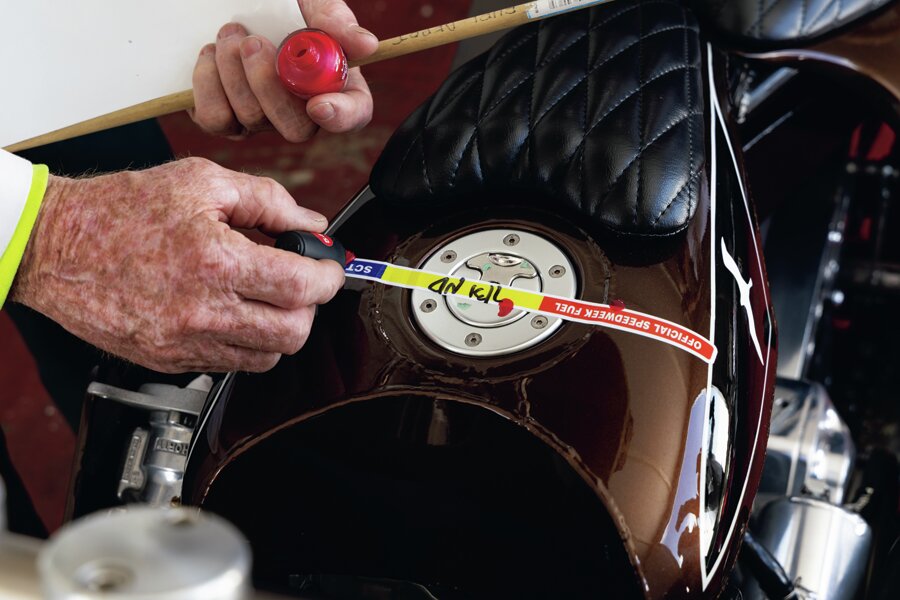 車検や装備などレギュレーションは想像以上に厳しい。松村さんがエントリーした「ガスクラス」は指定のガソリンを使用することがルール。給油後はテープで封印される。