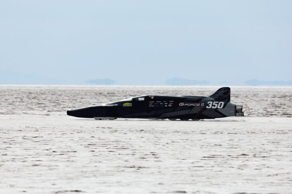 ロングコースがウエットになり閉鎖したためにショートコースでのチャレンジ。加速減速の区間が短いことが問題。測定上の記録は216マイルだが計測区間を超えた地点でのGPSは234マイルを表示。1マイルで減速しきれるか主催者も心配したが結果的には問題なかった。