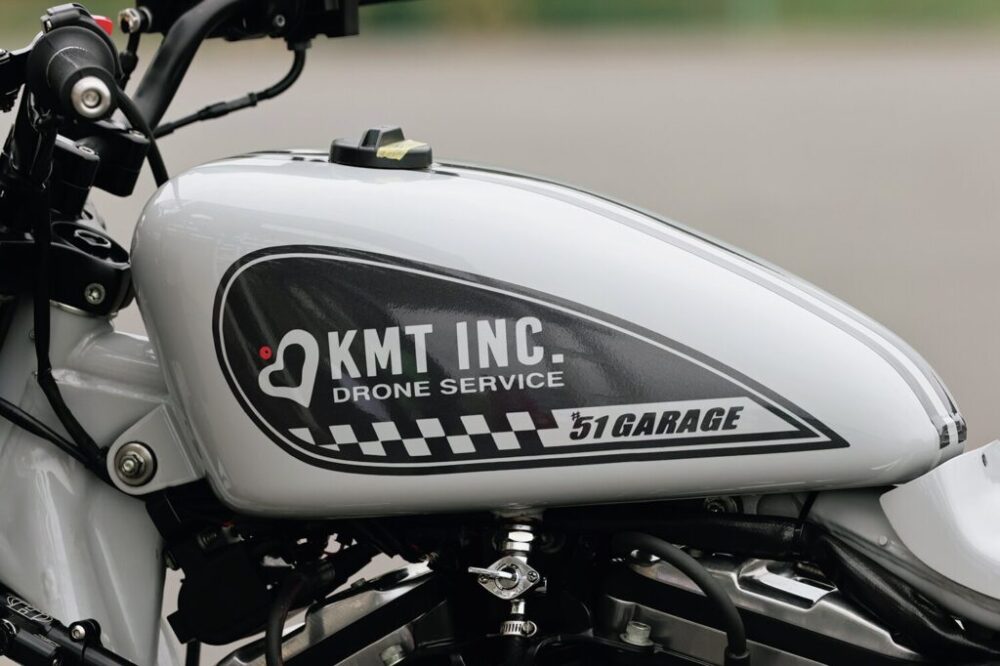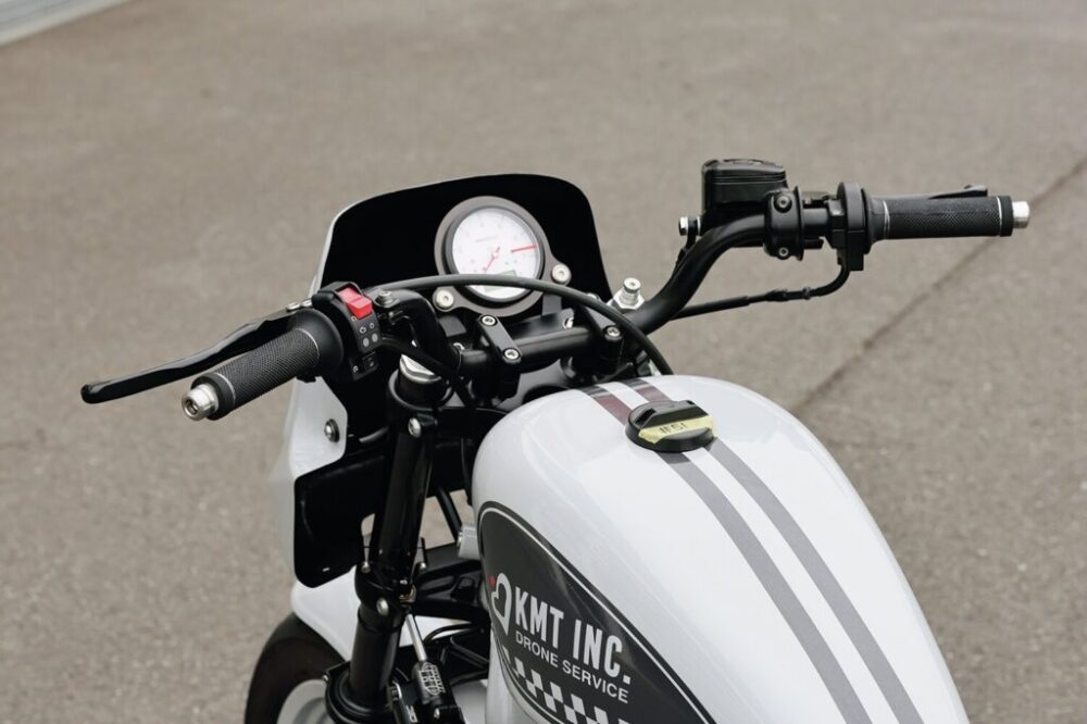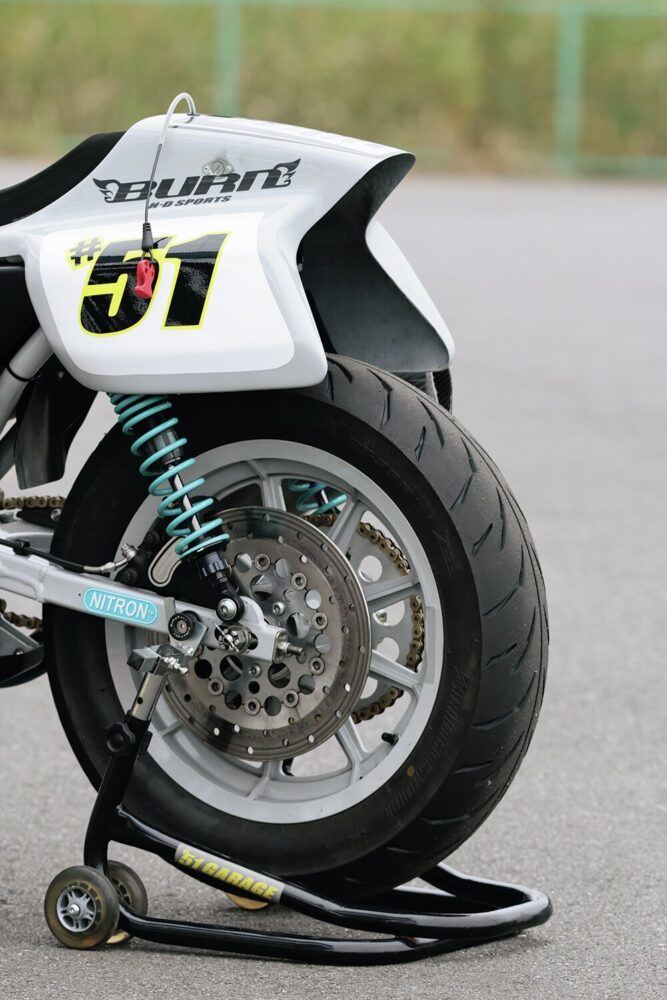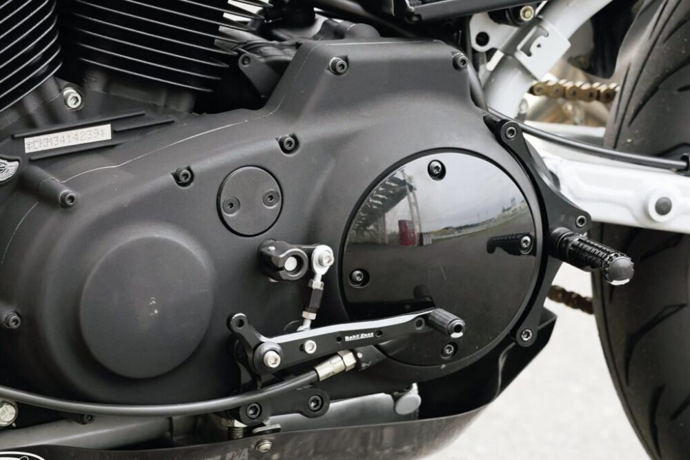 奥川さんによるチューニングエンジンを搭載。XL1200S用フロントフォーク、ナイトロンのサスペンションで足まわりを強化。ミスミエンジニアリングのライザーにミリバーをセットし、ベビーフェイスの試作ミッドバックステップで操作性を確保。ノジマ製チタンマフラーはワンオフで製作している。