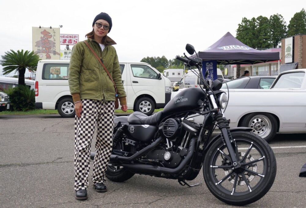 自然体のお洒落な雰囲気でスポーツスターに跨るMIZUKIさん。コーディネートはウエストライドのキルティングジャケットに、総柄のチェッカーパンツを合わせるなど、難易度高めのアイテムも難なく着こなしてしまうファッショニスタだ。車両は大きな変更こそないものの、かつて転んで傷を付けてしまったというタンクを、マットブラックで塗装し、純正を残しつつクールな印象を打ち出した。