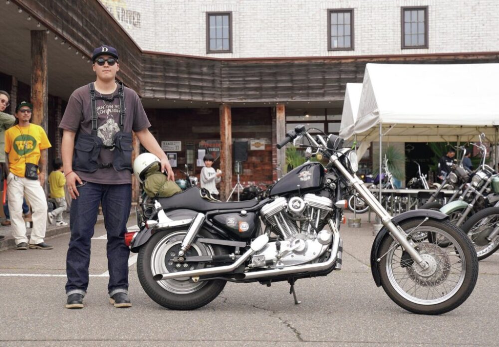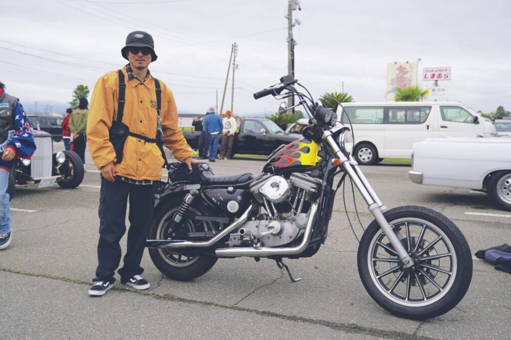 目を引くフレイムスのタンクを積み、フォークを6インチ延長した「スポーツスター」は、見るからに軽快そうなチョッパースタイル。着こなしは、コーチジャケット×ベストで、動きやすさと機能性を両立。車両のカスタムの方向性とも相まって、ストリート感のある佇まいを生み出している。