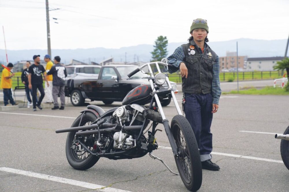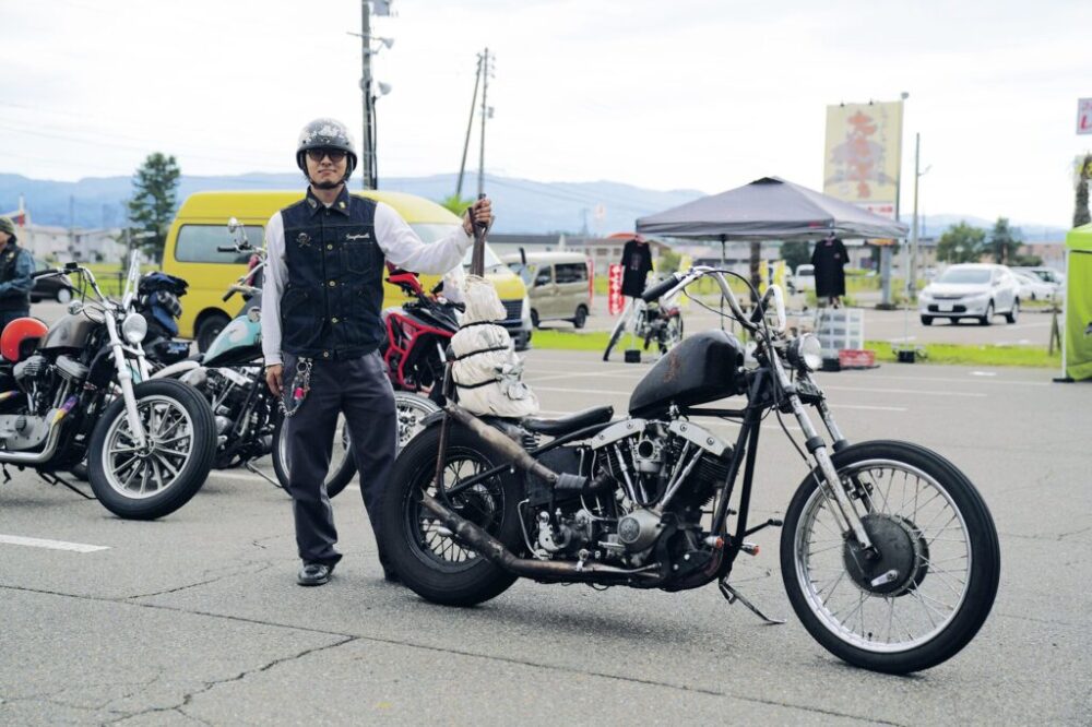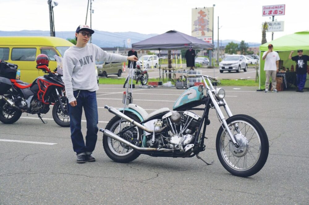 古着を主軸にバランスよくコーディネートを組みあげたSOTAさん。愛車のショベルはエイジングが進んだ雰囲気たっぷりの外装で、細いシルエットがお気に入りだとか。オイルタンクには自筆の落書きなどもあったりと、自分のスタイルを確立したクールなバイクライフを楽しんでいる。