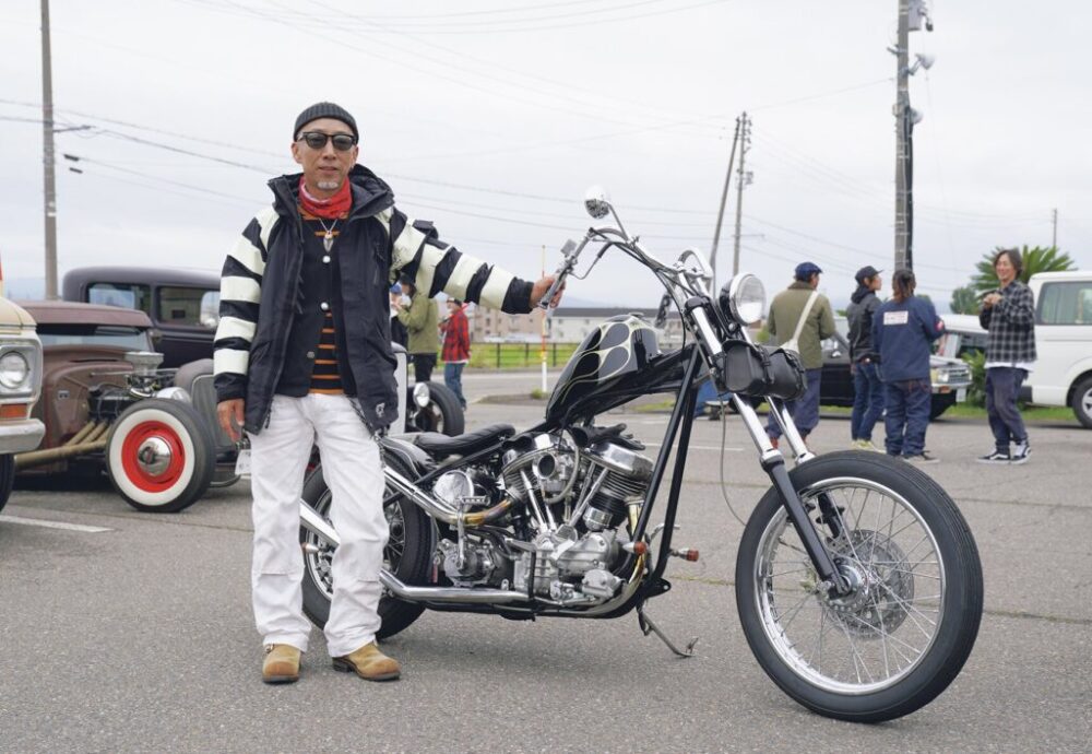 ウエストライドの中井社長もスナップ! 数ある愛車の中でもお気に入りという油圧式テレスコフォークを採用したハイドラモデルのパンヘッド。コーデイネートはウエストライドのネルシャツや、アンパルとのコラボキャップなど肩ヒジ張らないリアルなアメリカンスタイルが感じられる流石の着こなしに。