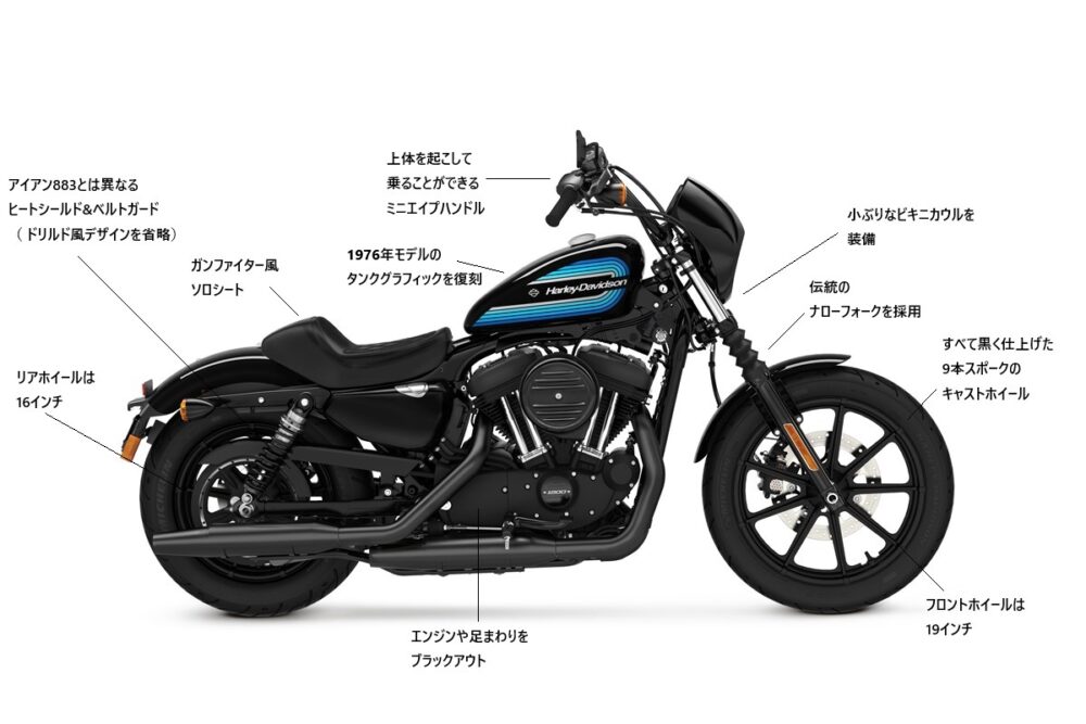 「スピードクルーザー」と呼ばれるカスタムが世界的に注目を集めていたことから、それ風にカスタマイズするスポーツスターユーザーも増加。それを受け、アイアン883の基本的ディテールを踏襲しつつも、スピードクルーザー風のエッセンスを落とし込んだ、アイアン1200独自のスタイルが生まれた。