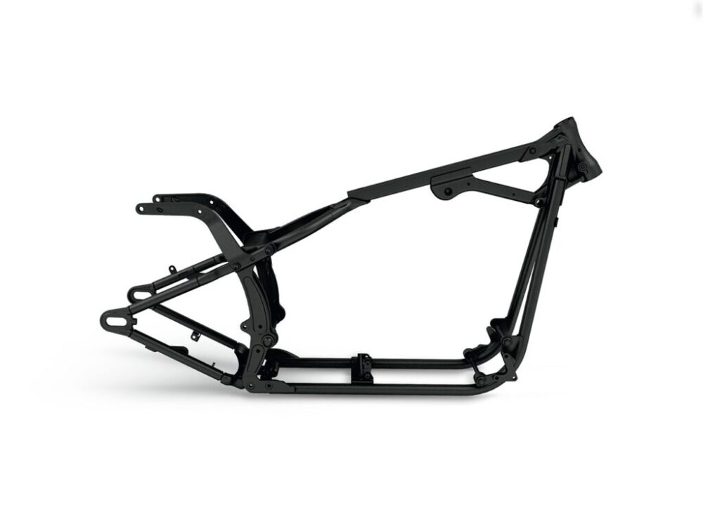 「こんなハーレーがほしい」というユーザーのさまざまな要望に応えることを目指して、単なるクラシック風だけでなく多種多様なモデルに対応するように進化したのが現行型のフレームだ。旧型と比較すると(写真右・白/現行型、オレンジ/旧型)ネックとバックボーンの位置が高く、さらにダウンチューブ(下側)の前後長が短くなった。さらに注目はリアショックのモノサス化とスイングアームのスリム化。リジッドフレーム由来のシルエットだった旧型に比べて、大幅に洗練されたことがわかる。見た目以外にも、フレームの剛性が大幅にアップしたほか、軽量化も実現するなど走りの性能に直結する部分も進化している。