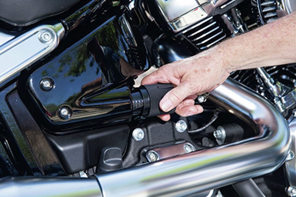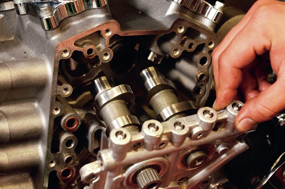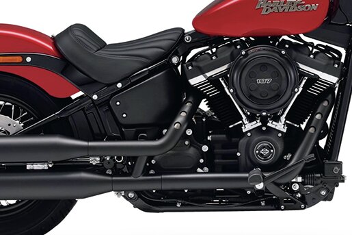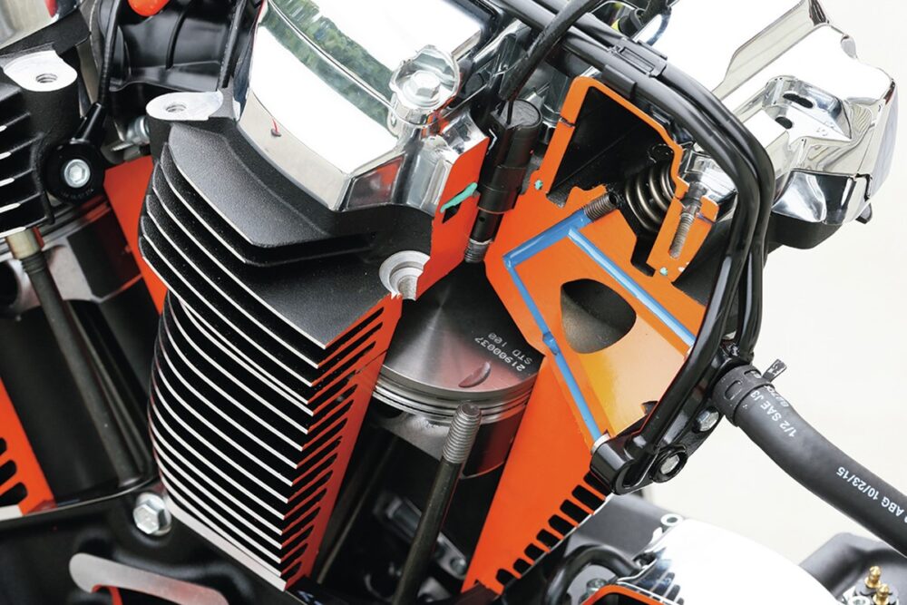 M8から、シリンダーヘッドはそれまでの「2バルブ」から、吸気と排気でそれぞれバルブを2つ備えた「4バルブ」へと進化した。単純に1つに対して2つのほうが多く吸入でき、多く排出できるという理論だが、空気を横から1つの吸入口で吸い込んでいるハーレーの場合、前後のシリンダーが空気を奪い合い、さらに2つになったインテークバルブによって乱流を起こしまくってしまう。このネガな要素を利用して、低中回転域で空気とガソリンをよく混ぜ、完全燃焼に利用しているのがM8流の4バルブヘッドなのだ。加えてツインプラグにすることで燃料を燃やし尽くし、排出ガスをクリーンにするというワケである。
