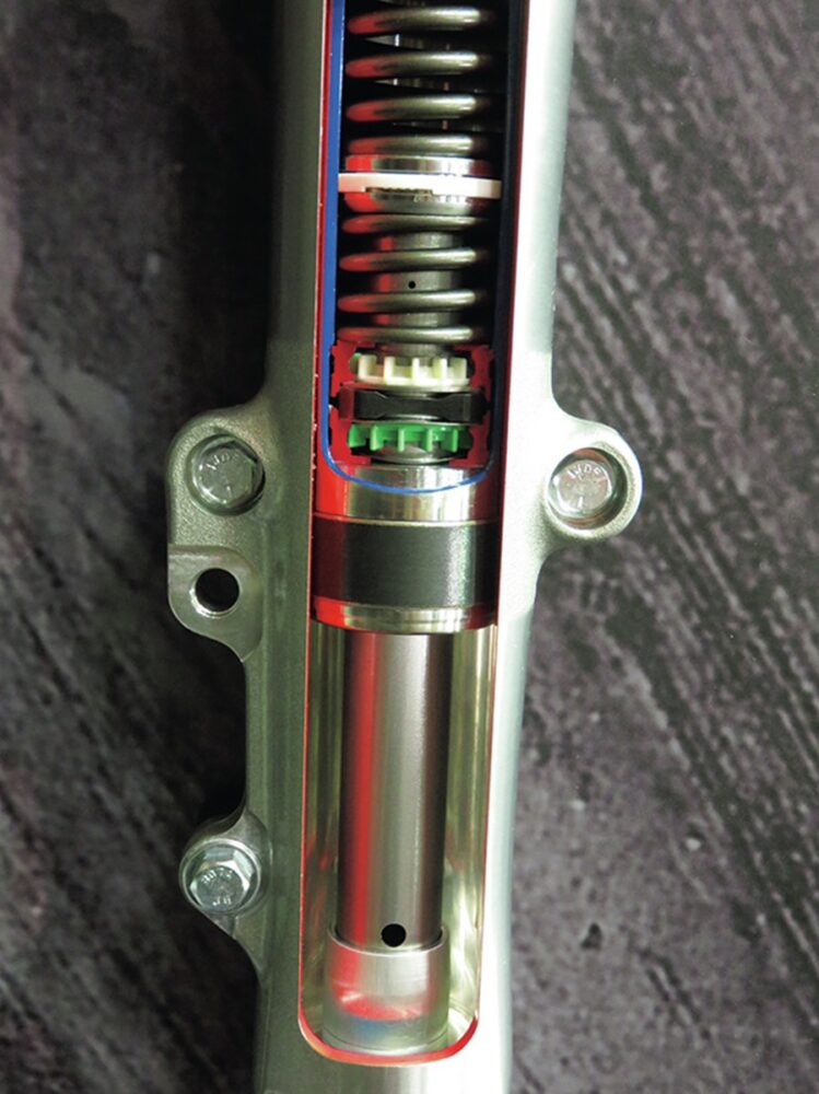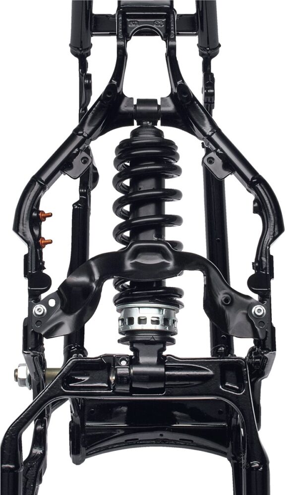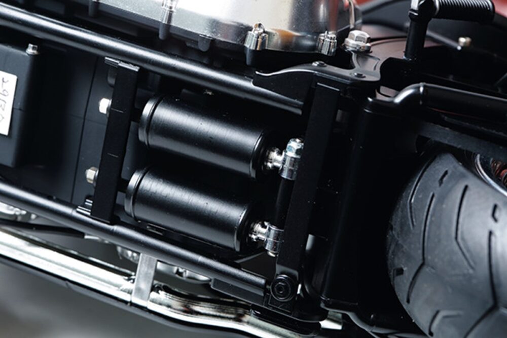 通常とは逆方向に可動するリアショックだった旧型とは異なり、現行型はスイングアームの上部に取り付けられたため、サスペンションの動きが自然に。また、旧型は路面の段差で底づきしていたが、現行型は十分なストローク量を確保。減衰力もしっかりと効くようになったため、簡単にフルボトムしてしまうことはなくなった。何よりプリロードの調整が簡単にできるので、乗り方や体重、荷物の重さなどに応じてセッティングすることが可能に。90kg以上の荷物を載せてもしなやかに動くように設計されているというから、その進化たるや相当なものだ。