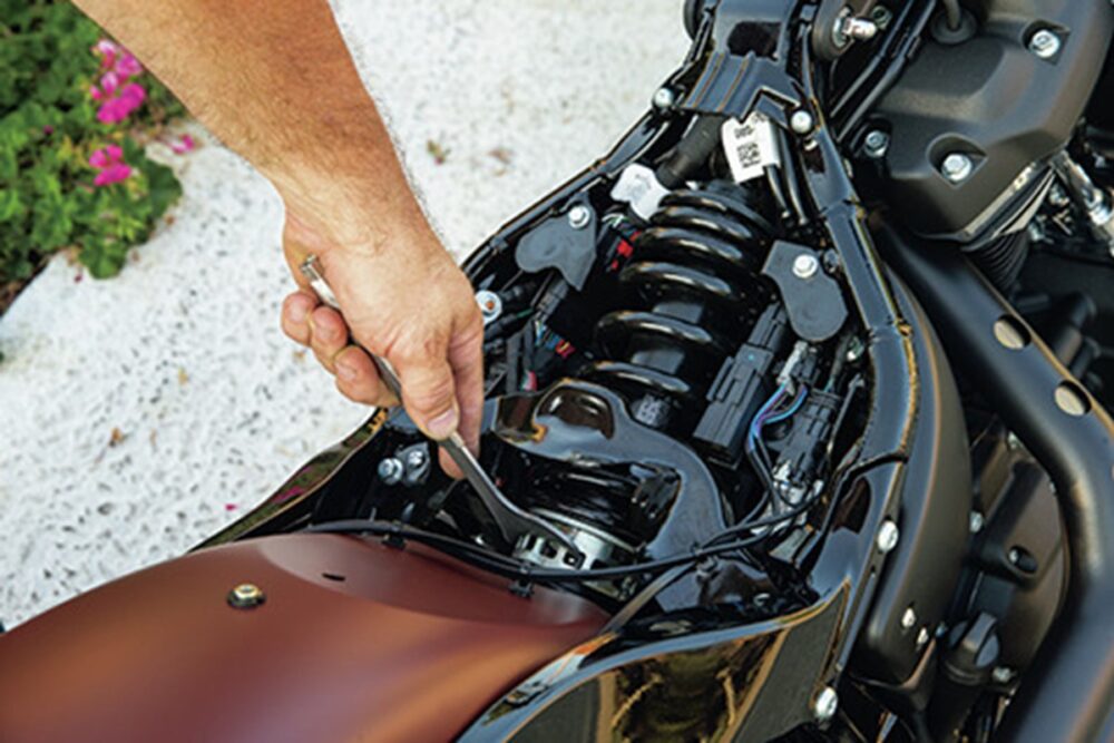 新たに採用されたプリロード調整機能は車種によってその方法が異なるが、マフラー側のサイドカバー下にあるダイヤルを回して調整できるモデルもあって、とてもイージーだ。