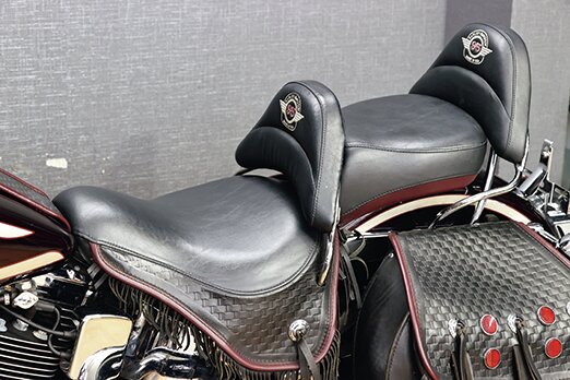 型押しレザーとコンチョで装飾された純正のサドルシートとピリオンパッド。95周年記念のエンブレム入りバックレストは純正オプション。