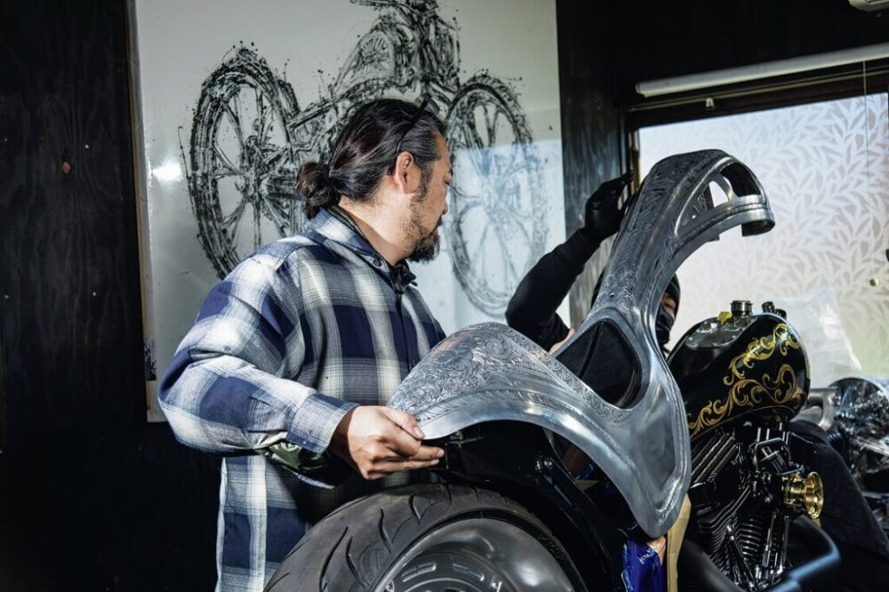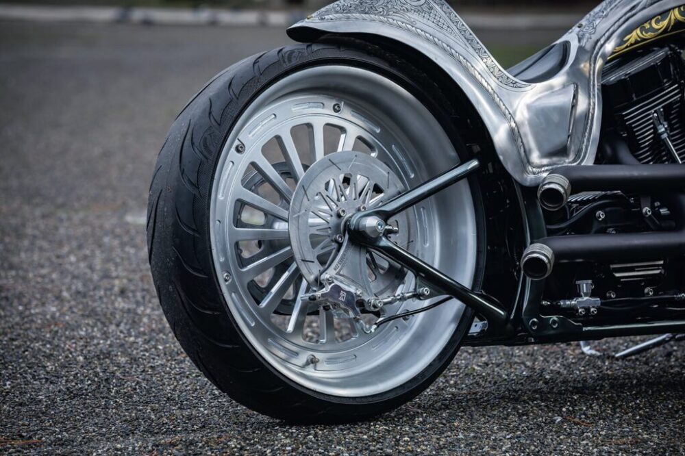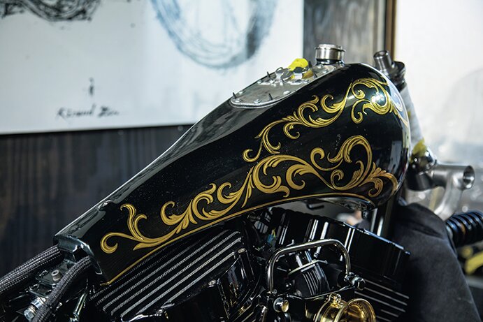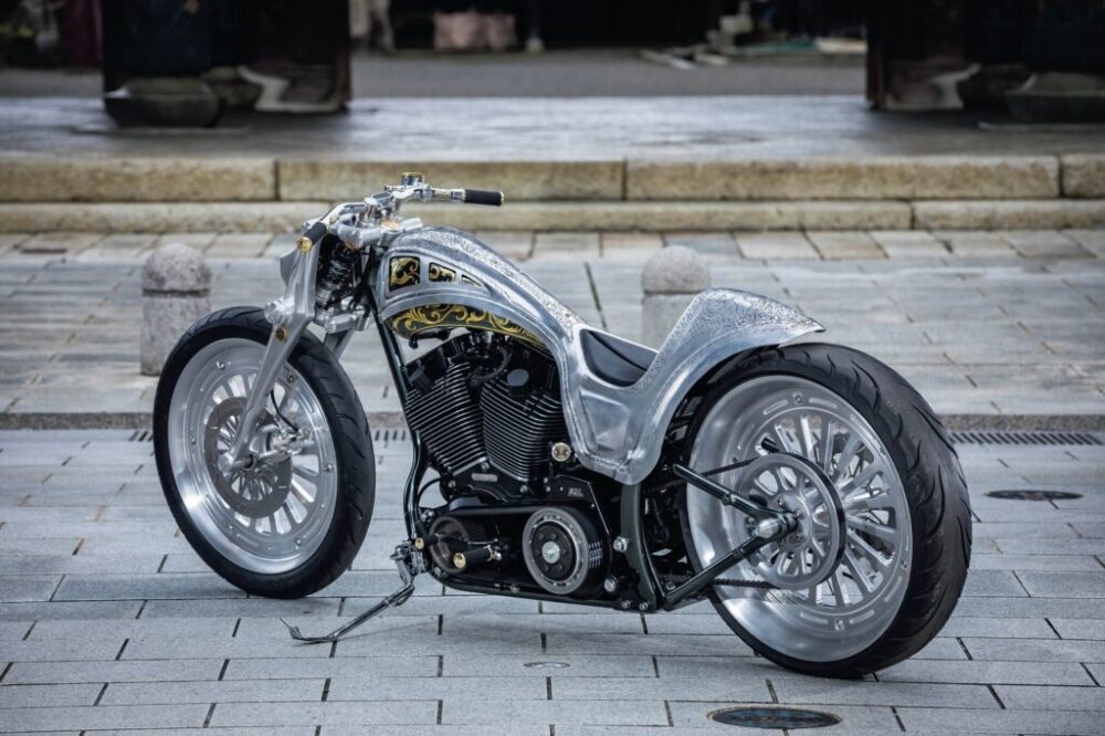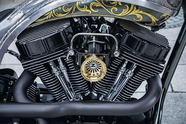 シングルクレードルのソフテイルフレームに搭載する、彫金があしらわれたアルミボディと24金リーフのインナータンクが重なり、和洋折衷を演出。ソフテイルをベースにしたのは、オーナーはこの車両が初ハーレーだったために、インジェクションモデルの安心感とカスタムの自由度の高さが決め手となった。ソフテイルとはいっても、ほぼ一から作ったカスタムメイドだが、純正フレームをシングルクレードルにモディファイしたかのような細部のデザインが見所となる。
