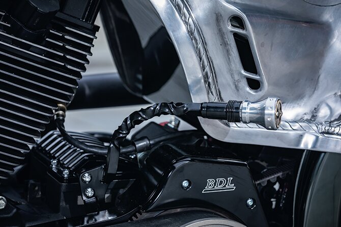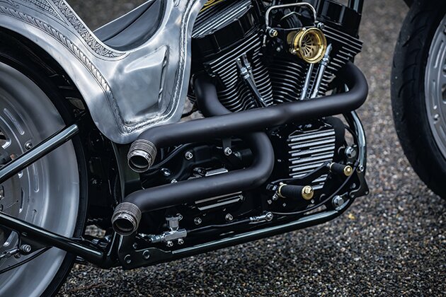 パンスタイルのロッカーカバーを装備するエンジンは2017年ソフテイルのバランサー付きツインカムにストリート用のハイカムをインストール。ブラスのヴェロシティスタックスはZONのオリジナル。