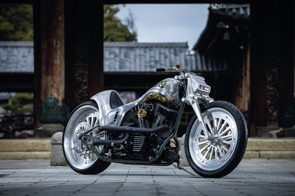 シングルクレードルのソフテイルフレームに搭載する、彫金があしらわれたアルミボディと24金リーフのインナータンクが重なり、和洋折衷を演出。ソフテイルをベースにしたのは、オーナーはこの車両が初ハーレーだったために、インジェクションモデルの安心感とカスタムの自由度の高さが決め手となった。ソフテイルとはいっても、ほぼ一から作ったカスタムメイドだが、純正フレームをシングルクレードルにモディファイしたかのような細部のデザインが見所となる。