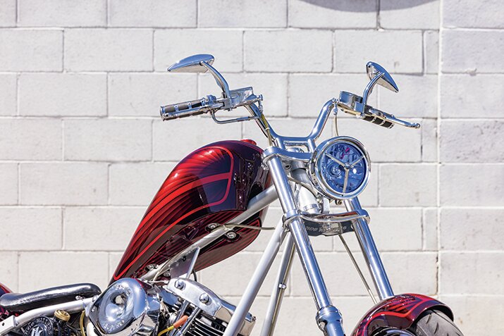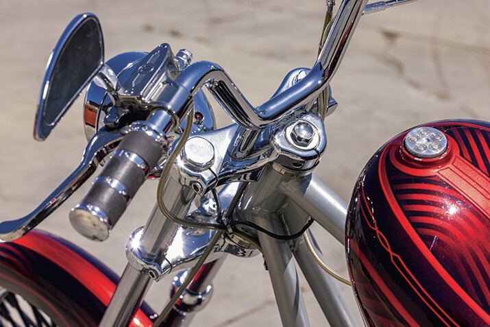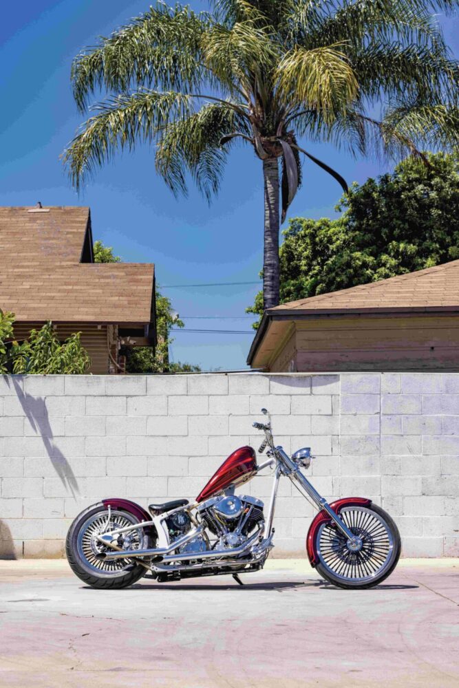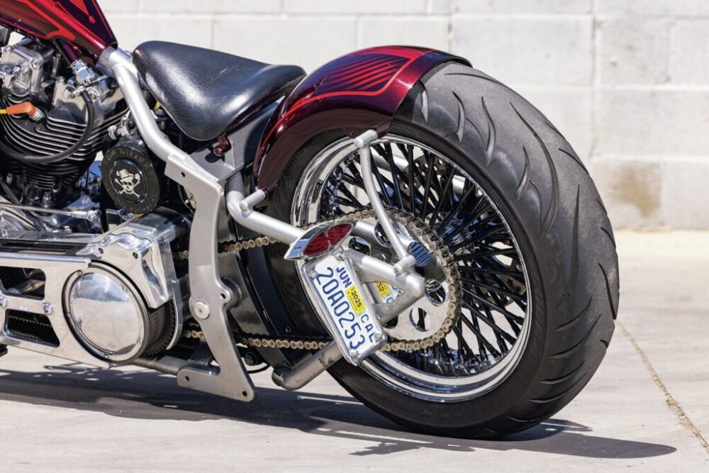 理想のネック角の追求、そしてワイドタイヤを履くため、フレームメーカーに一点物のソフテイルフレームをオーダーしている。ネック位置は4インチアップ&2インチロングで、そこにセットアップされた6インチオーバーのフォークと相まって、チョッパー然としながらもコントローラブルな印象だ。シルバーのフレームにワインレッドの外装が鮮やかに映える。