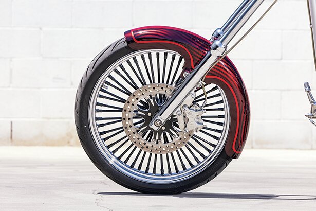 フロントは21インチ。ホイールはシニスターの代名詞であるファットスポーク。ブラックのスポークが足元を精悍に引き締める。フロントフェンダーはWCC製。