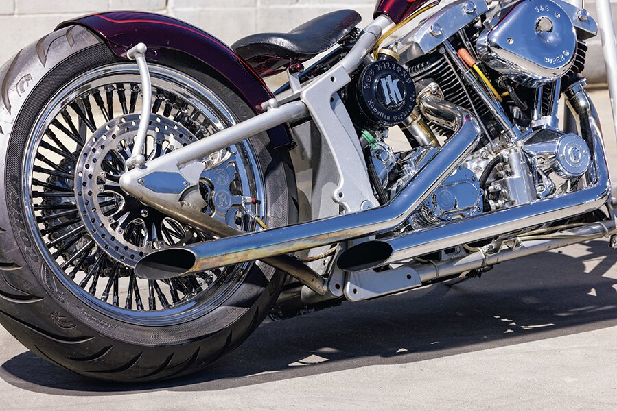 リアホイールは16インチ、200ワイドのファットなタイヤを履く。ホイールはフロントと同じくシニスター製のファットスポークを選択。エキゾーストパイプは旧いチョッパーの雰囲気を好むというオーナーからのオーダーでドラッグパイプをワンオフで製作している。