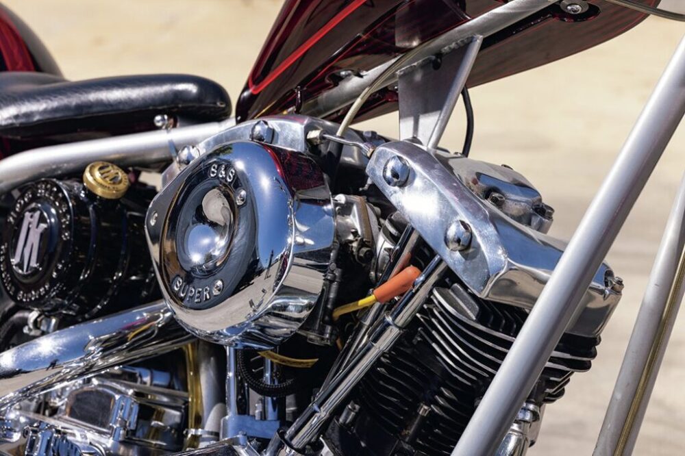 60~70年代に定番の内燃機カスタムであったツインプラグ化を施し、さらにケース等をS&S製に換装した排気量98cuのホットなショベルモーター。キャブはS&SのEキャブをチョイス。