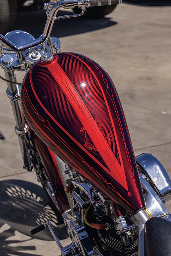 ガスタンクはニュースクールチョッパーの定番WCC製Villainタンク。美しいワインレッドの塗装はホットドッグ・カスタムズが手がけている。