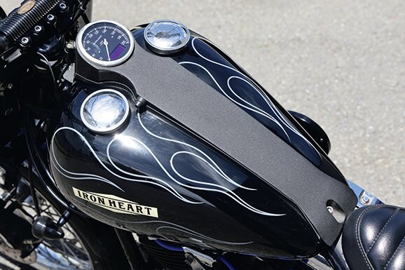 ノーマルに見える分割タンクだがカットしてスリムに仕上げている。メーターはモトガジェット。ピンストライプはホッピングシャワーによる。