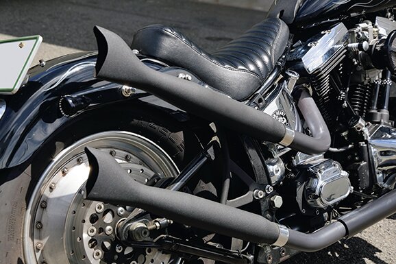 アップスイープなフィッシュテールがチョッパーらしさを醸し出す。ワンオフで製作したエキパイの緩やかなアールはパンヘッドを模している。