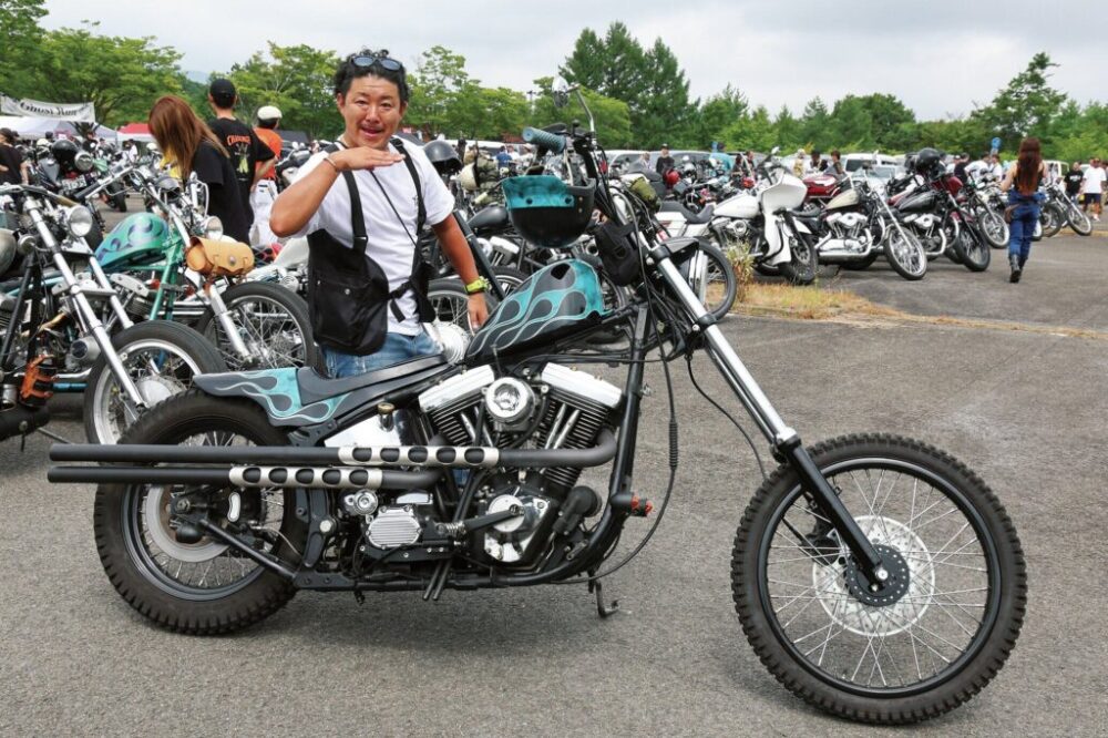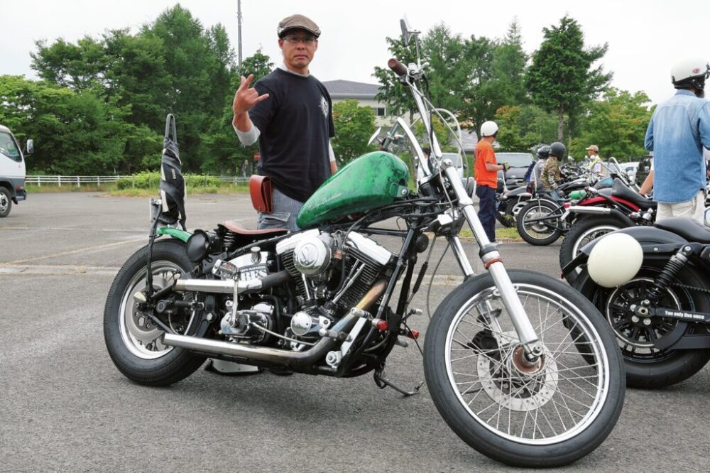 「ゴーストランは最高に楽しいです」とヒロミさん。テツヤさんと2台で会場にやって来たそうです。ヘリテイジのフロントまわりをスプリンガーにしたチョッパー。キャブもテツヤさんと同じくHSR。スポーツスタータンクとハイパイプ、それにリアのオフロードタイヤがかなりワイルドですが、さらにすごいのがノーマルのカバーをカットしたオープンプライマリーでした。
