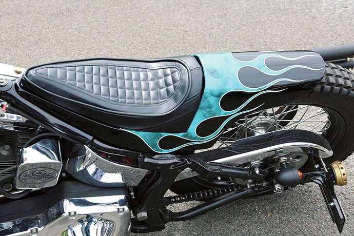 ハイマウントしたスポーツスタータンクとシンプルなフェンダーにはグリーンのマーブルペイントが施されている。