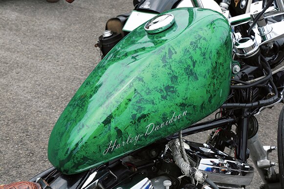 まだ「カスタム途中」という阿部さん。ヘリテイジ系のエボをベースにご自身でいろいろとカスタム。タンク。フェンダーのグリーンのマーブルペイントもDIYだそうです。タンクは、スポーツスターのキングタンクをハイマウント。フレームが見えるのがサマになるのがエボ・ソフテイルのいいところ。SUキャブ&エアクリーナーとキックを付けたことでヴィンテージ感が増しています。
